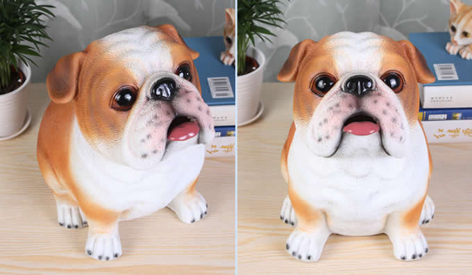 Coin bank with a fun design featuring a slot for coins at the Dog's mouth and a plugged hole in the bottom